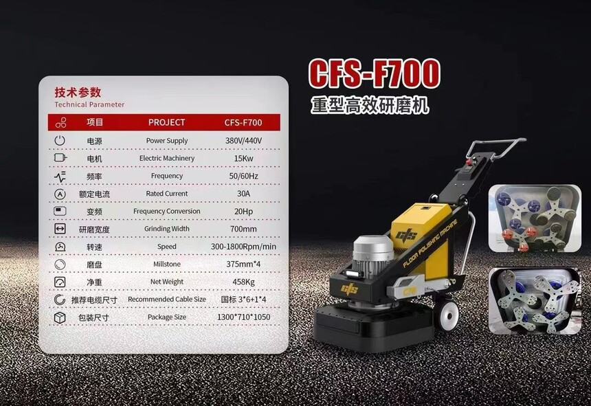 感受康富斯700重型研磨机的强大魅力!金属材质打造,重型设计,驱动一键行走,效率高,散热性能出色。CFS-F700品牌保证品质可靠,458Kg净重稳固耐用。工作轻松,效果出众。让您的工作更高效,更舒适!